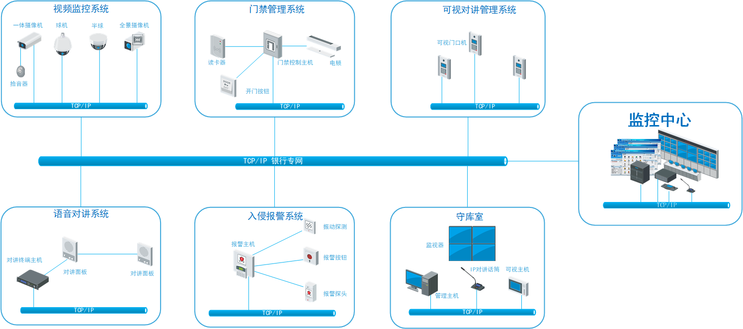 银行金库技防部分分为6个子系统:视频监控系统、门禁管理系统、语音对讲系统、入侵报警系统、可视对讲系统、守库室防护监控系统,满足GA858-2010《银行业务库安全防范的要求》标准要求。